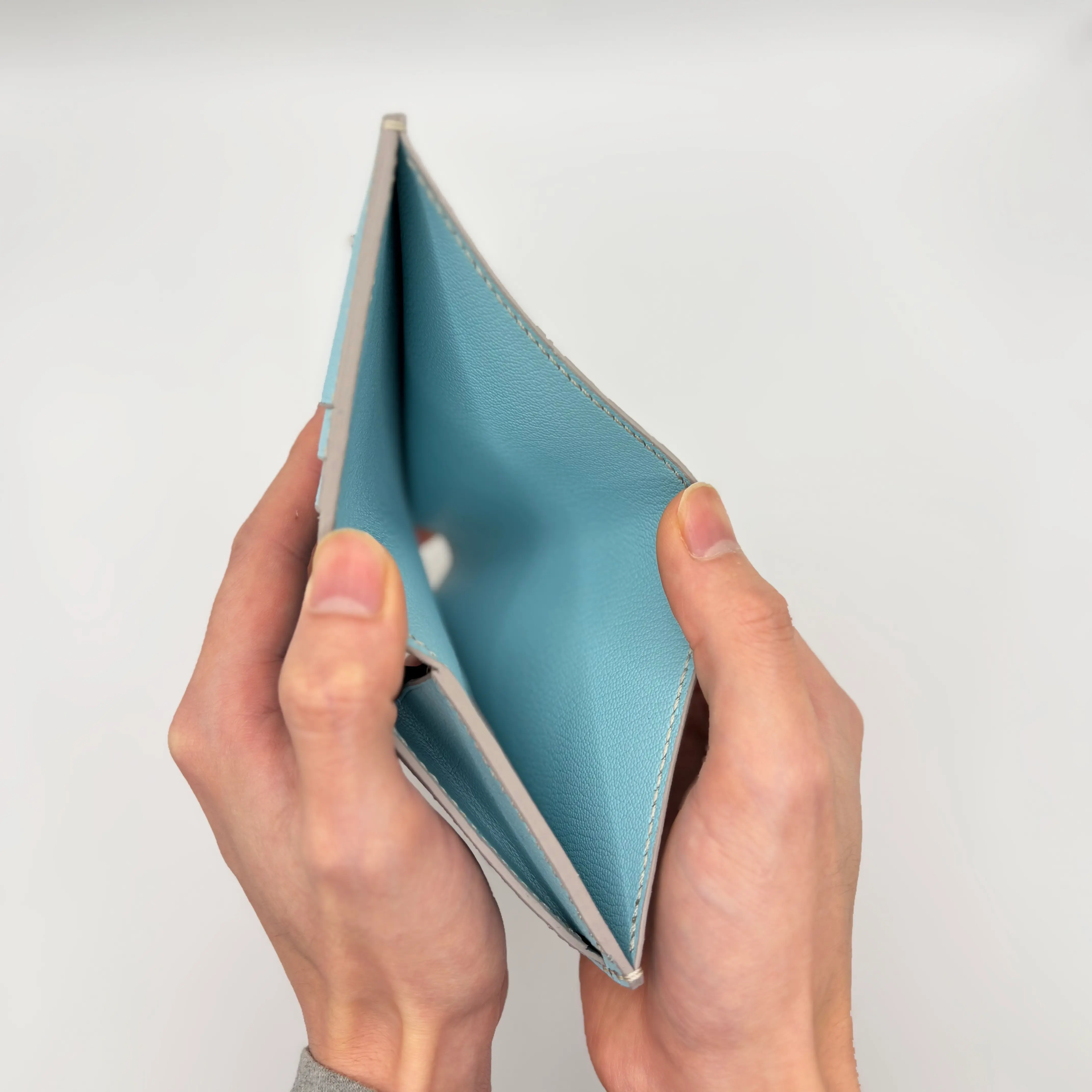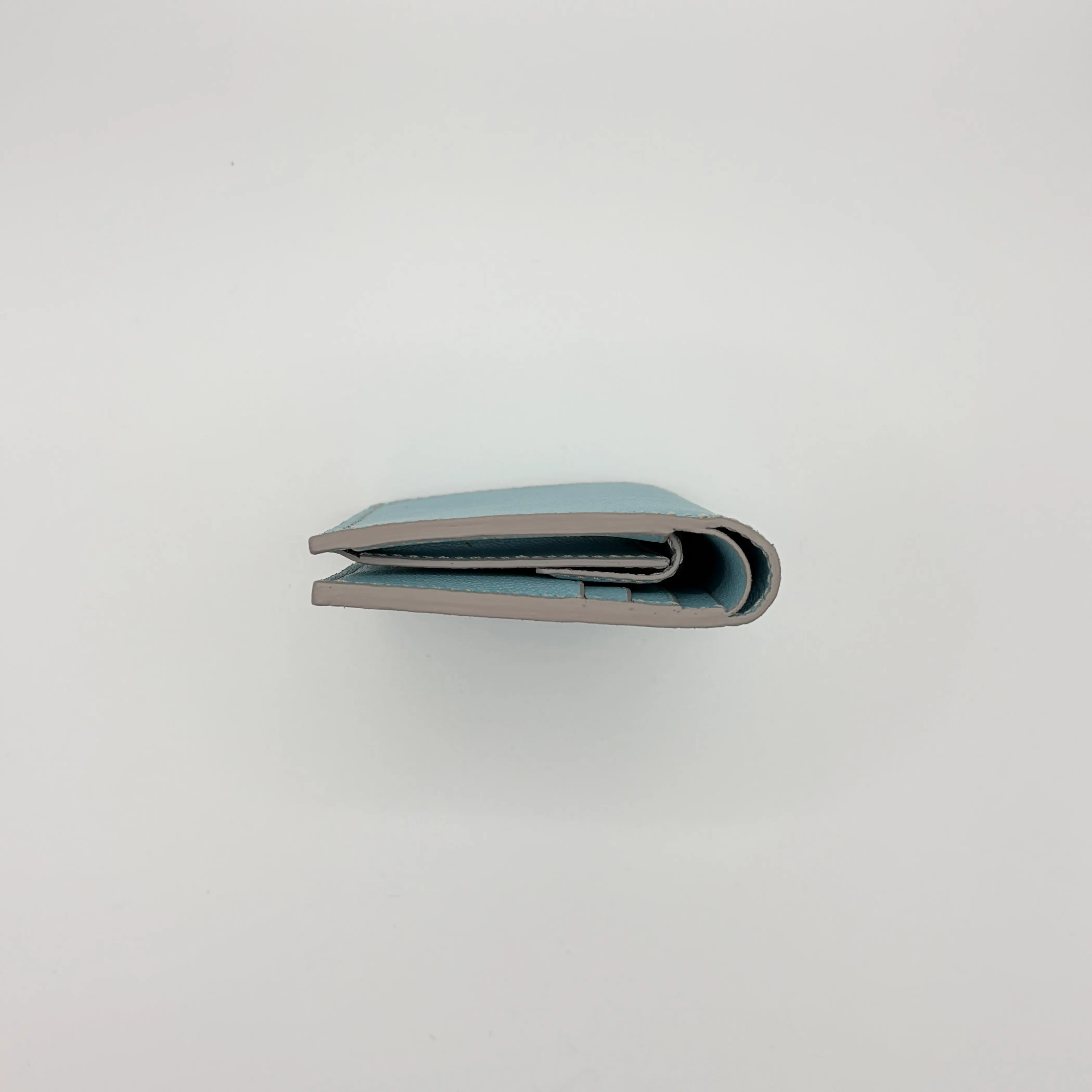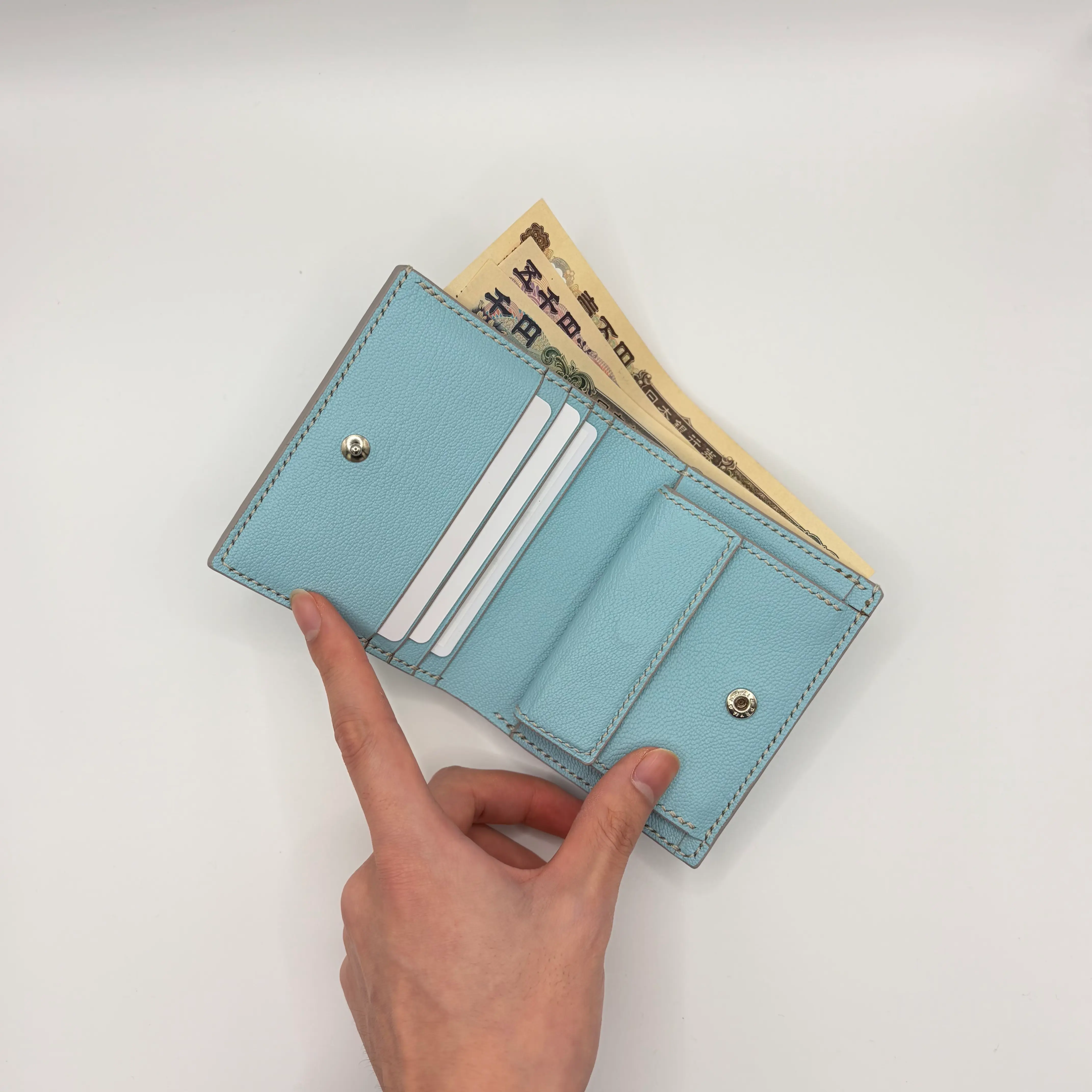 Itsumoarigatoneを象徴する財布 Sabi 淡い水色の2つ折りの財布になっています。 コンパクトで手に馴染みます。 フランス産のシェーブル(やぎ)を贅沢に使用した財布になります。 床面(革の裏側)が見えない仕様となっており、高級感があります。 !!!!!!!!!! 受注生産のため制作に1~3週間ほどかかります。